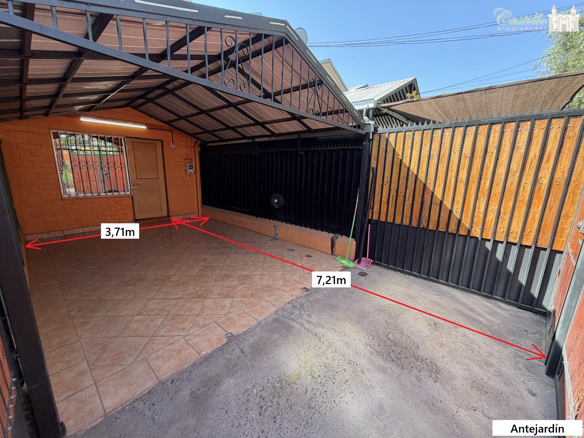 Estacionamiento con capacidad para 2 vehículos tipo city car, con un ancho máximo aproximado de 2,69m. Propiedad cuenta con portón metálico con madera, de apertura mecánica. Además, cuenta con un cobertizo amplio de estructura metálica.