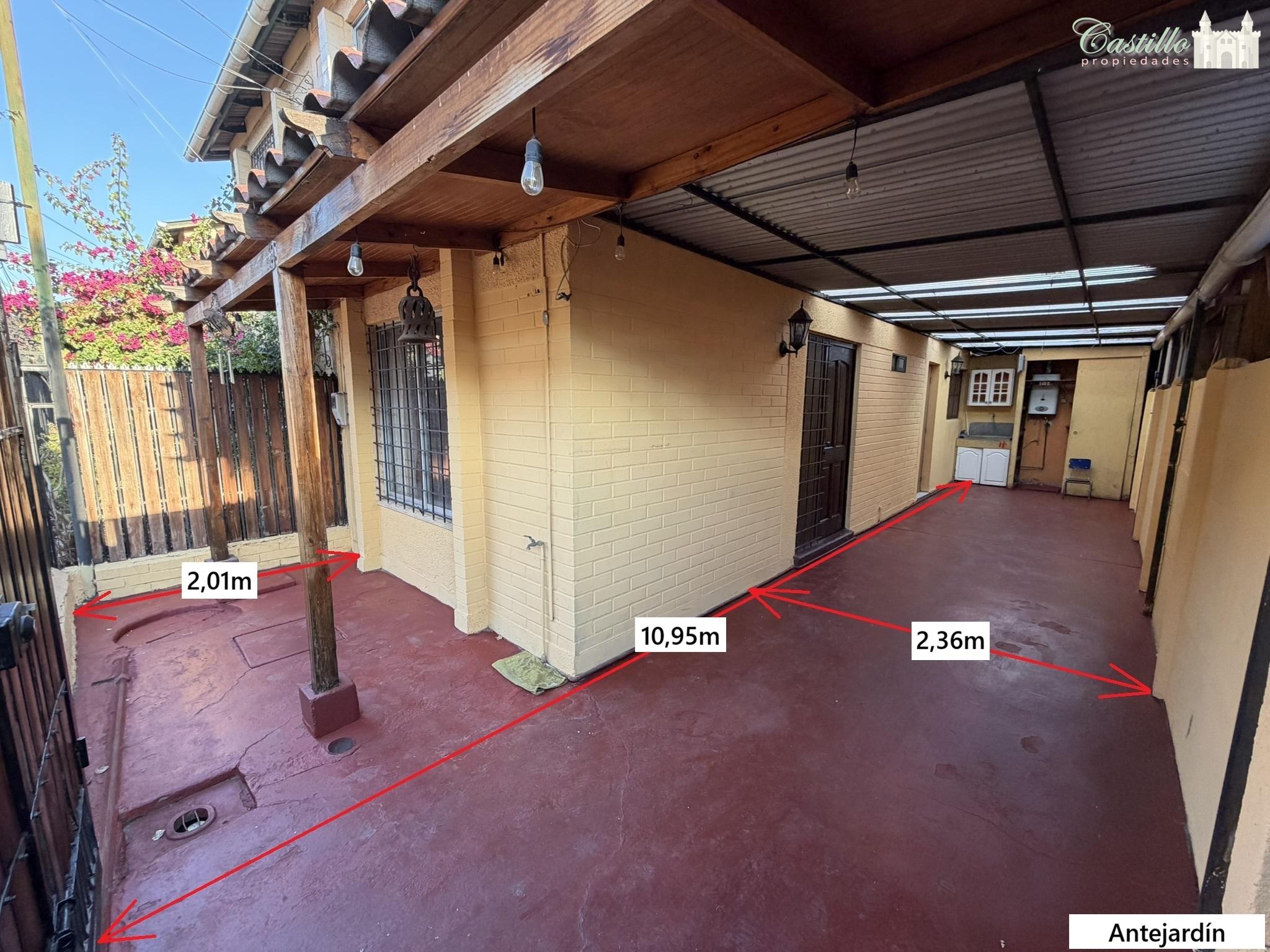 Estacionamiento con capacidad para 2 vehículos tipo city car, con un ancho máximo aproximado de 2,36m. Propiedad cuenta con portón metálico con madera, de apertura mecánica. Además, cuenta con un cobertizo amplio de estructura metálica.