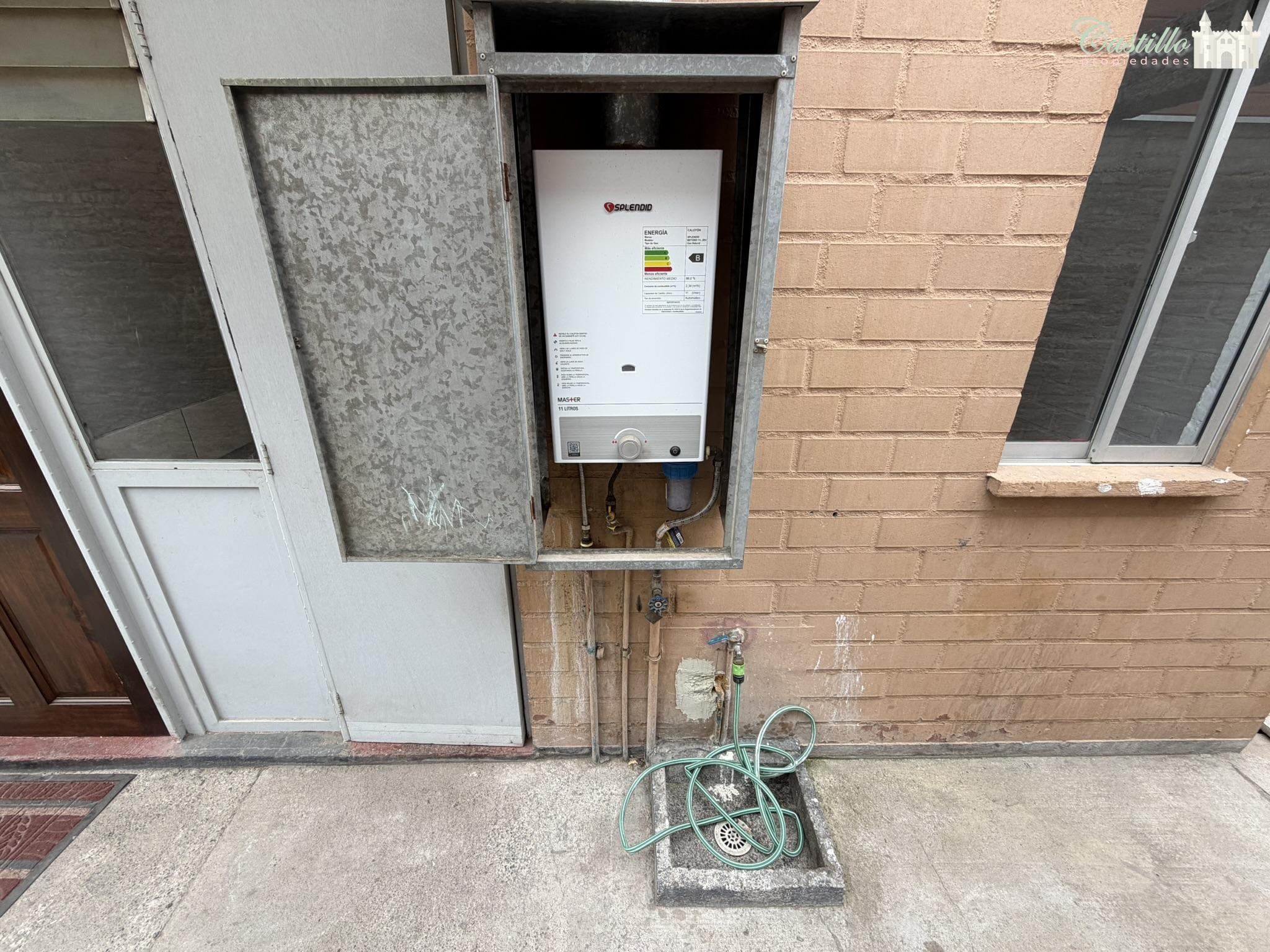 Sistema de agua caliente funciona mediante calefón, ubicado en el exterior de la propiedad. Tanto el calefón como la cocina utilizan gas de cañería. En la cocina se encuentra la instalación para lavadora.